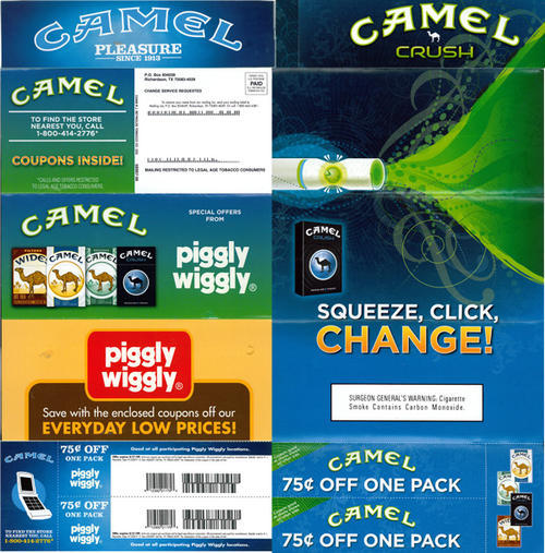 Both sides of a direct mail brochure in promotion of Camel Crush (a cigarette which can be adjusted from a non-menthol to a menthol cigarette by squeezing a capsule in the cigarette's filter - "Squees, Click, Change!"). This direct mail piece is in joint promotion with Piggly Wiggly convenience stores, providing two cigarette pack coupons good at all participating Piggly Wiggly locations. The piece also provides a phone number to call for help in locating the store nearest you.