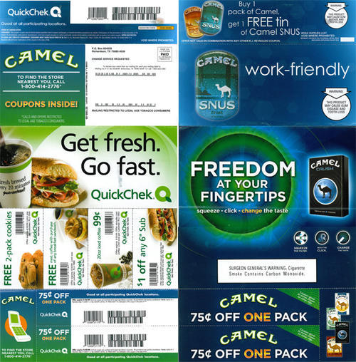 Both sides of a direct mail brochure in promotion of both Camel Crush (a cigarette which can be adjusted from a non-menthol to a menthol cigarette by squeezing a capsule in the cigarette's filter - "freedom at your fingertips")and Camel Snus, a smokeless tobacco product ("work-friendly"). This direct mail piece is in joint promotion with Quick Check convenience stores, providing two cigarette pack coupons, and a coupon for a free tin of Camel Snus with the purchase of one pack of Camel, good at all participating Quick Check locations. The piece also provides 4 coupons for Quick Check food and drink items.
