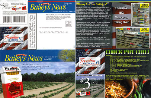 Spring 2009 direct mail newsletter in promotion of Bailey's cigarettes. Piece also comes with a coupon for $3.00 off 3 packs or 1 carton.
