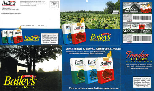 Direct mail in promotion of Bailey's cigarettes. "American grown, American made." Piece also recommends smokers to "save your pack UPCs to earn Bailey's Cash Cards", and participate in the brand's rewards program. Two coupons are also included: 1 coupon for $3.00 off a 3 pack purchase and 1 coupon for $3.00 off 1 carton.
