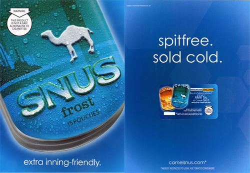 Two sided magazine ad in promotion of Frost flavored Camel Snus, featuring a large image of the tin package on the front side of the ad. The tin is covered with beads of water, a reference to the fact that the product is sold cold. Underneath the image are the words "extra inning-friendly." On the back side of the ad is a coupon for a free tin of Camel Snus upon purchase of any tobacco product.