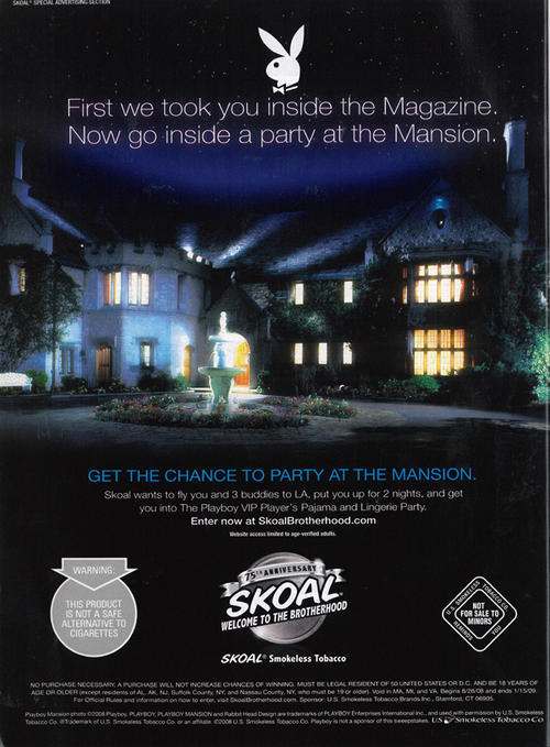 Ad promotion for a Playboy themed sweepstakes belonging to a 12 page special Skoal section found in the January 2009 issue of Playboy, in honor of Skoal's 75th Anniversary. Skoal obtained consumer input on the content and look of the spread in months prior. Starting in July 2008, the Skoal brand website (www.skoalbrotherhood.com) included a section where users could give their input on content for the Skoal spread in Playboy. Skoal users voted on models to use, celebrity interviews to include, and dipper jokes and “rules” to share. To see the other ads found in this special issue, select Skoal from the Brand field, type 2009 in the Year field, and type Playboy in the Additional Keywords field.