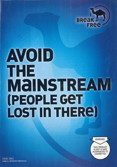 One page blue ad for Camel Snus, featuring a silhouette of a Camel and the words, "avoid the mainstream (people get lost in there)". In the upper right corner is another image of a blue camel and the slogan "Break Free". No image of the product is shown.
