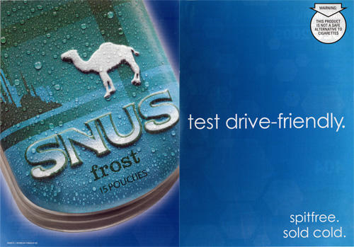 Two page magazine ad in promotion of Frost flavored Camel Snus, featuring a large image of the tin package on the left side of the ad. The tin is covered with beads of water, a reference to the fact that the product is sold cold. On the right page of the ad are the words: "test drive-friendly. spitfree. sold cold."