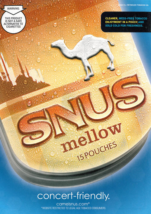 Magazine ad in promotion of Mellow flavored Camel Snus, featuring a large image of the tin package. The tin is covered with beads of water, a reference to the fact that the products are sold cold. The following text is found below the product image: "concert-friendly". The brand's website, camelsnus.com, is also included. In the top right corner are a few listed product claims: "cleaner, mess-free tobacco enjoyment in a pouch and sold cold for freshness."