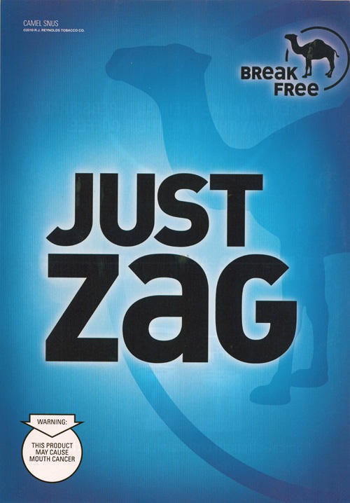 One page blue ad for Camel Snus, featuring a silhouette of a Camel and the words, "just zag". In the upper right corner is another image of a blue camel and the slogan "Break Free". No image of the product is shown.