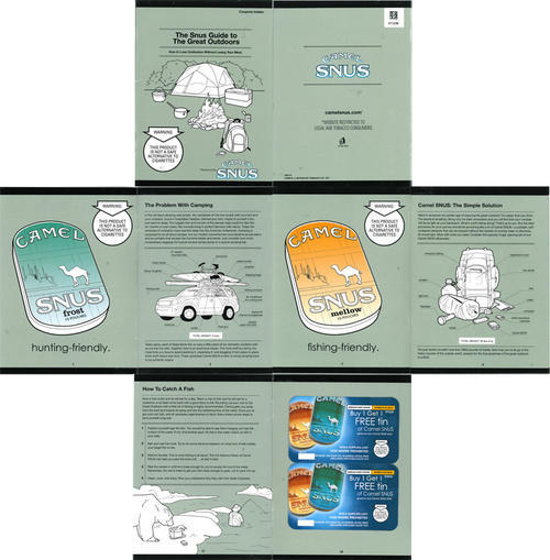 Booklet sent by direct mail in promotion of Camel Snus. The 13 page booklet is a humorous "snus guide to the great outdoors", a guide on "how to lose civilization without losing your mind". The last page of the booklet includes two buy one get one free coupons.
