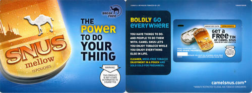 Direct mail piece received between December 2009 and January 2010 in promotion of mellow flavored Camel Snus. Coupon for one free tin of Camel Snus included. Text: "The Power to do your thing." "Boldly Go Everywhere." "You have things to do. And people to do them with. Camel Snus lets you enjoy tobacco while you enjoy everything else in life. Cleaner, mess-free tobacco enjoyment in a pouch and sold cold for freshness." Piece uses the slogan: "Break free".