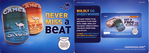 Direct mail piece received in January 2010 in promotion of mellow and frost flavored Camel Snus. Coupon for one free tin of Camel Snus included. Text: "Never miss a beat." "Boldly Go Everywhere." "You have things to do. And people to do them with. Camel Snus lets you enjoy tobacco while you enjoy everything else in life. Cleaner, mess-free tobacco enjoyment in a pouch and sold cold for freshness." Piece uses the slogan: "Break free".