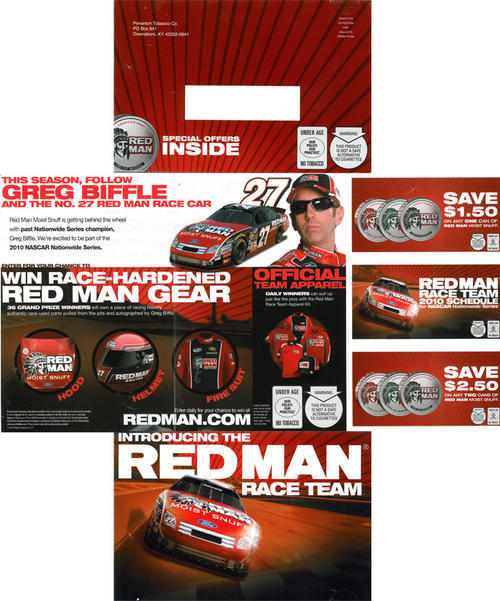 Direct mail from Red Man in promotion of the brand's racing sponsorship and racing themed sweepstakes. The sweepstakes can be entered daily by visiting the brand's website, www.redman.com. Piece comes with two coupons (1 for $1.50 off any one can; and 1 for $2.50 off any two cans).