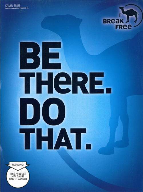 One page blue ad for Camel Snus, featuring a silhouette of a Camel and the words, "be there. do that". In the upper right corner is another image of a blue camel and the slogan "Break Free". No image of the product is shown.