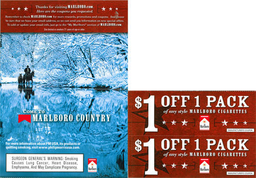 Direct mail piece from Marlboro thanking the receiver for visiting the brand's website (Marlboro.com) and providing two cigarette coupons that were offered on the website - two coupons for $1.00 off a pack. Piece features image of a cowboy on a horse traveling through a snow covered landscape.