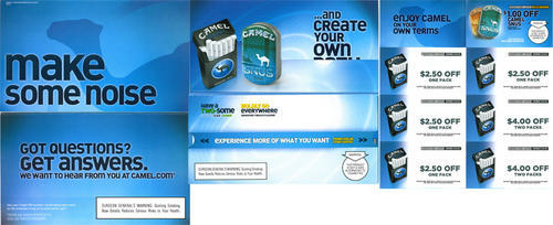 Direct mail from Camel advertising the Camel Crush line extension and also Camel Snus smokeless tobacco. The piece also comes with seven coupons: two coupons each for $4.00 off two packs; four coupons each for $2.50 off one pack, and one coupon for $1.00 off a tin of Camel Snus. Coupons expire 1/31/2010. Text: "Make some noise...and create your own path". Text on back of piece: "Got questions? Get answers. We want to hear from you at Camel.com"