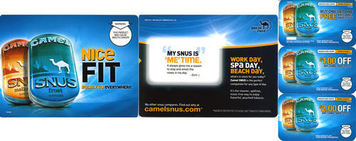 Direct mail piece received in April 2010 in promotion of mellow and frost flavored Camel Snus. Three coupons included: (one Buy one get one free coupon; one for $1.00 off a tin; one for $2.00 off a tin). Text: "Nice Fit." "Boldly Go Everywhere." "Work day, spa day, beach day, what's in store for you today? Camel Snus is the perfect companion for any type of day. It's the cleaner, spitfree, mess-free way to enjoy flavorful, pouched tobacco." Piece uses the slogan: "Break free".