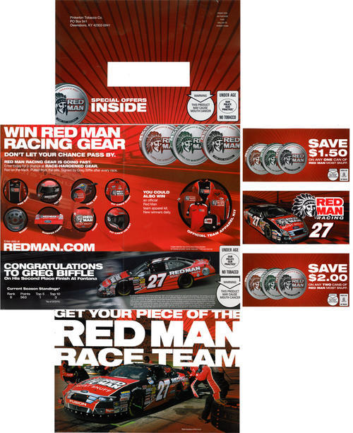Direct mail from Red Man received in April 2010 in promotion of a racing themed sweepstakes, featuring racing gear prizes. Receivers can enter daily at the brand's website, redman.com. Two coupons for Red Man moist snuff are included.