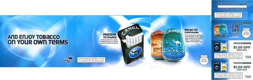 Direct mail from Camel advertising the brand's Camel Crush line extension and Camel Snus smokeless tobacco product. The piece also included three coupons, two for $1.50 off a pack of Camel cigarettes, and one for $2.00 off a Camel Snus tin. A duplicate version sent to another receiver included 7 coupons: six for $2.00 off one pack, and one for $2.00 off a Camel Snus tin. Text: "Change the rules." "And enjoy tobacco on your own terms." Includes the slogan, "Break Free".