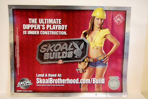 Point of sale advertisement for Skoal's special promotion in the January 2009 issue of Playboy, which included a 12 page special Skoal section in honor of Skoal's 75th Anniversary. Starting in July 2008, users were invited to visit Skoal's website (www.skoalbrotherhood.com)to help develop content for the spread by voting on models to feature, jokes to include, etc. To see resulting ads found in this special issue, select Skoal from the Brand field, type 2009 in the Year field, and type Playboy in the Additional Keywords field.