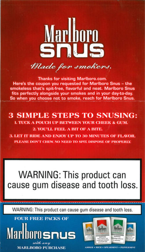 Direct mail in promotion of Marlboro Snus sent in May 2010, including a coupon for four free pack of Marlboro Snus with any Marlboro purchase. Mailing was based on coupon offer presented on the brand's website. Piece also includes "3 simple steps to snusing." Text: "Marlboro Snus. Made for smokers." "Thanks for visiting Marlboro.com. Here's the coupon you requested for Marlboro Snus - the smokeless that's spitfree, flavorful and neat. Marlboro Snus fits perfectly alongside your smokes and in your day-to-day. So when you choose not to smoke, reach for Marlboro Snus."