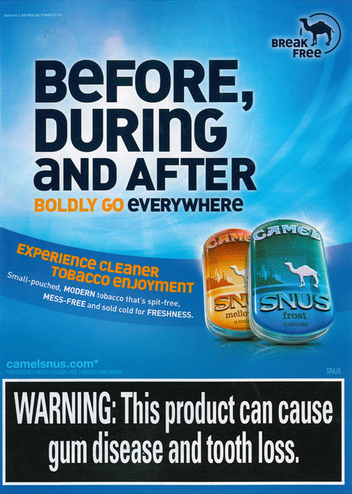 One page ad for Camel Snus, featuring an image of the product in two flavor styles - mellow and frost. In the upper right corner is an image of a blue camel and the slogan "Break Free". Ad text: "Before, during and after. Boldly go everywhere. Experience cleaner tobacco enjoyment. Small-pouched, MODERN tobacco that's spit-free, MESS-FREE and sold cold for FRESHNESS." Ad includes a new larger warning label as required to be included on smokeless tobacco advertising by June 22, 2010, under the FDA's regulation of tobacco.