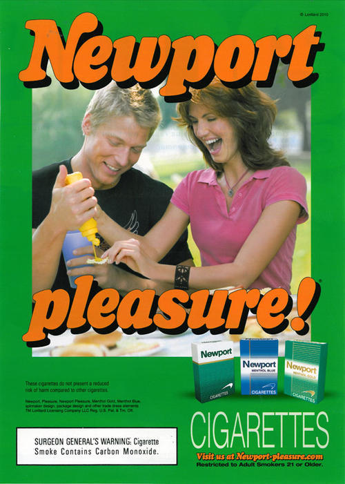 Ad for Newport cigarettes featuring a couple outside laughing and enjoying a barbeque.This ad is almost identical to a previous version appearing in May 2010 magazine issues. However, images of the previously labeled "medium" and "lights" style packs have been replaced with images of packs labeled as "menthol blue" and "menthol gold". In addition the word "cigarettes" is prominently featured in the bottom right corner of this version of the ad.