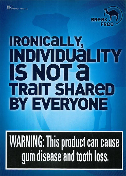 Blue colored ad for Camel Snus, featuring a silhouette of a Camel and the following text: "Ironically, individuality is not a trait shared by everyone." In the upper right corner is another image of a blue camel and the slogan "Break Free". No image of the product is shown.