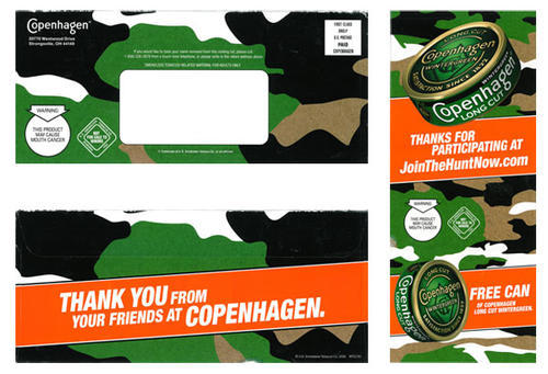 Camouflage and hunting themed direct mail from Copenhagen thanking the receiver for participating in a version of the brand's website, jointhehuntnow.com, launched in promotion of the brand's new Wintergreen product style. On this website users can get a free gift, test their "hunting skills" with an online game, and receive additional coupons. This mailing includes a coupon for a free can of Copenhagen long cut wintergreen.