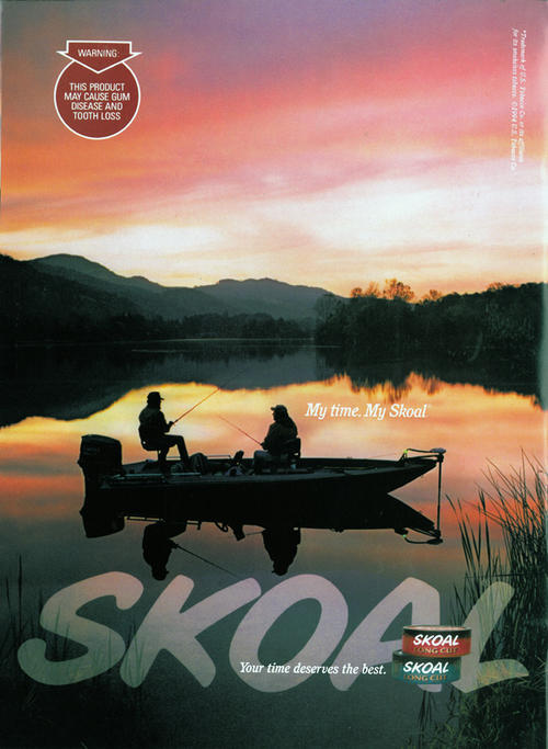 Skoal ad featuring an image of two men in a boat fishing. Text: "My time. My Skoal". "Your Time Deserves the Best!".