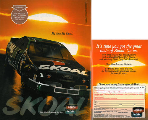 Ad for Skoal featuring an image of a Skoal branded Ford racing car. "My time. My Skoal." "Your time deserves the best." Ad found in the Fall 1995 issue of Heartland magazine, a controlled circulation magazine from the United States Smokeless Tobacco Company. A card on the adjacent page allowed users to mail in their information to receive a free sample of Skoal Long Cut Cherry and Skoal Long Cut Spearmint.