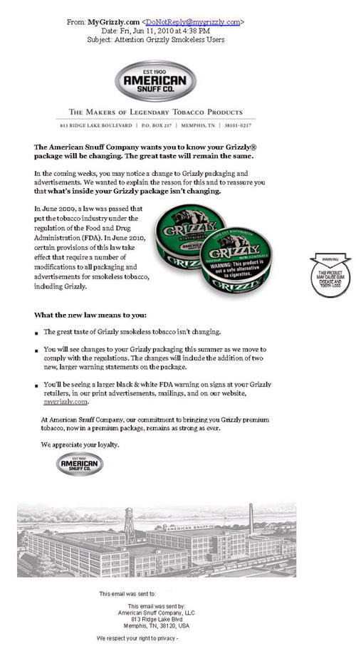 E-mail from the American Snuff Company warning consumers that Grizzly packaging and advertising will soon be changing because of FDA regulation, including enlarged warning labels, but assuring customers that the great taste of Grizzly "will remain the same." (email)