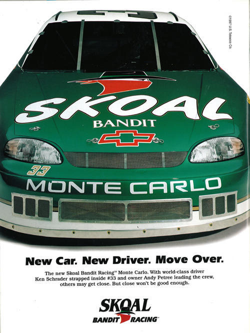 Ad in promotion of Skoal Bandit Racing. Text: "New car. New driver. Move over." "The new Skoal Bandit Racing Monte Carlo. With world-class driver Ken Schrader strapped inside #33 and owner Andy Petree leading the crew, others may get close. But close won't be good enough." Ad found in the January/February 1997 issue of Heartland, a controlled circulation magazine from the United States Smokeless Tobacco Company.