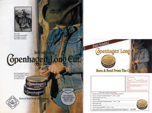Copenhagen ad featuring an image of a cowboy opening a can of Long Cut. "Introducing Copenhagen Long Cut." "New Copenhagen Long Cut. The same premium tobacco. Same original flavor. In a whole new cut." Adjacent page included a request form to mail in for a free product sample. Ad found in the May/June 1997 issue of Heartland, a controlled circulation magazine from the United States Smokeless Tobacco Company.