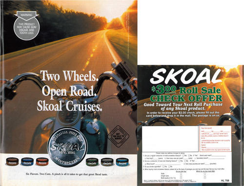 Skoal ad, featuring an image of a motorcyle on an open road. "Two wheels. Open road. Skoal cruises." "Six flavors. Two cuts. A pinch is all it takes to get that great Skoal taste."