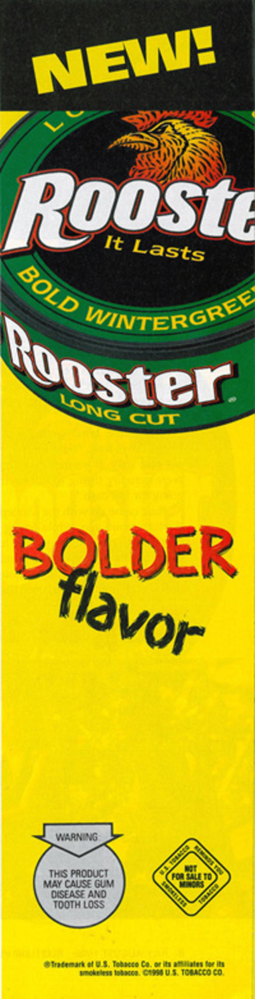One-third page ad for Rooster smokeless tobacco, in bold wintergreen long cut flavor. "New!" "Bolder flavor". Ad found in the July/August 1998 issue of Heartland, a controlled circulation magazine from the United States Smokeless Tobacco Company.