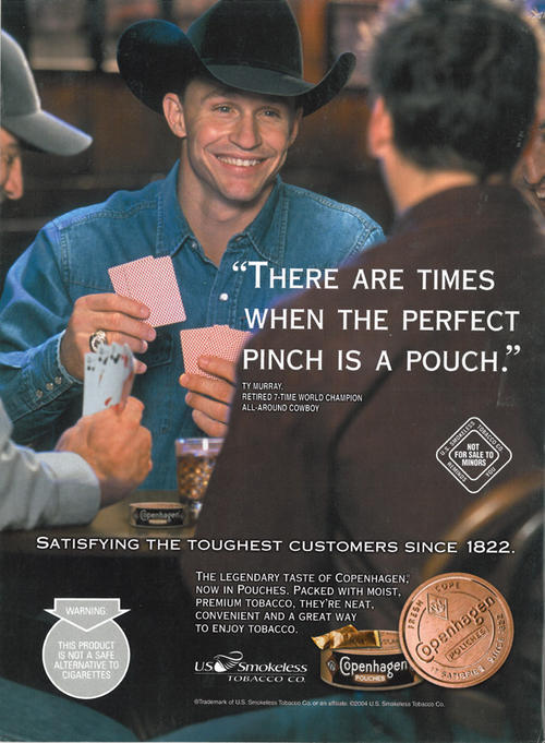 Ad for Copenhagen smokeless tobacco. Image of Ty Murray, a retired 7-time world champion cowboy, playing cards with two men. "There are times when the perfect pinch is a pouch. Satisfying the toughest customers since 1822." "The legendary taste of Copenhagen, now in pouches. Packed with moist, premium tobacco, they're neat, convenient, and a great way to enjoy tobacco".