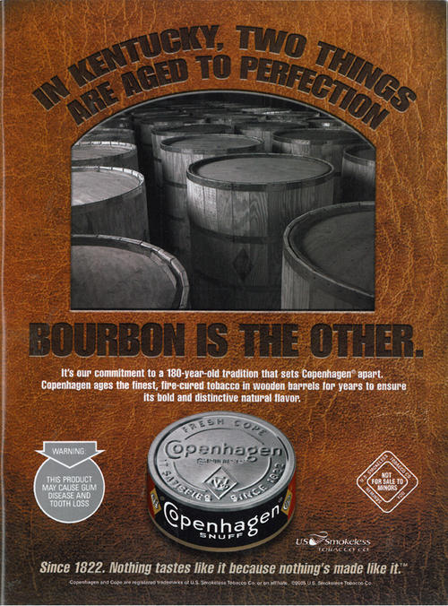 Ad for Copenhagen smokeless tobacco. Text: "In Kentucky, two things are aged to perfection. Bourbon is the other. It's our commitment to a 180-year old tradition that sets Copenhagen apart. Copenhagen ages the finest, fire-cured tobacco in wood barrels for years to ensure its bold and distinctive natural flavor."