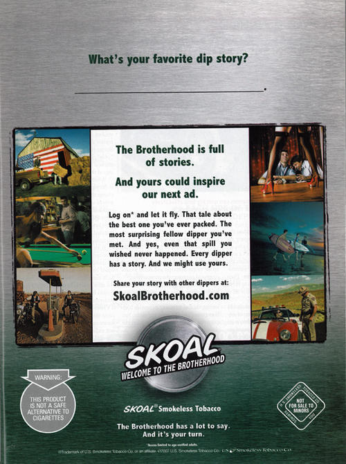 Ad in promotion of Skoal's "Welcome to the Brotherhood" campaign, and inviting users to submit their best dip stories through the brand's website. Submitted stories may be used to "inspire" future ads. Text: "What's your favorite dip story?" "The Brotherhood is full of stories. And yours could inspire our next ad. Log on and let it fly. That tale about the best one you've ever packed. The most surprising fellow dipper you've met. And yes, even that spill you wished never happened. Every dipper has a story. And we might use yours."