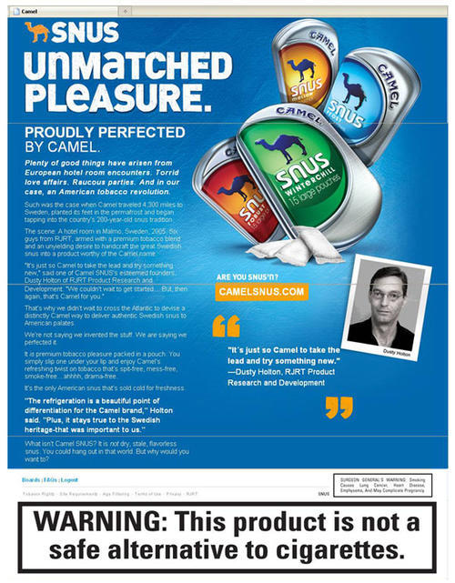 Screen shots of new web page about Camel Snus from www.camel.com. This topic/page was added to the website between June 23rd and July 2,2010, describes the development of Camel Snus, and depicts the product in a new style of packaging, although no reference to this change is made in the narrative.
