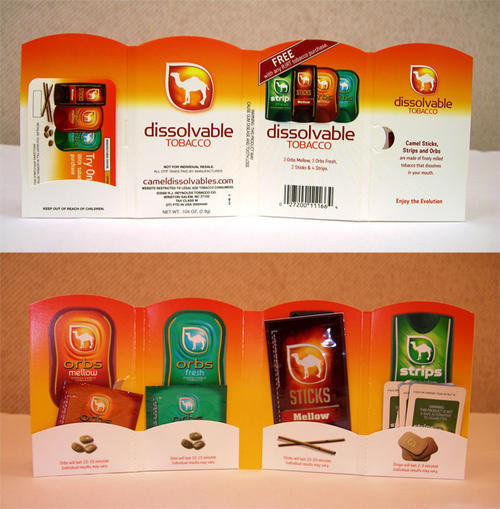 Camel Dissolvables sampler packs, as observed given away for free in retail stores in Ohio. Sampler includes 3 Mellow Orbs, 3 Fresh Orbs, 2 Sticks and 4 Strips. A coupon for a free dissolvables product with purchase of a tobacco product was also included.