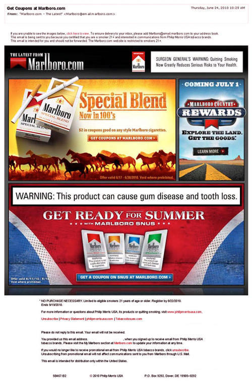 Marlboro email in promotion of a coupon offer for Marlboro "Special Blend" and Marlboro Snus, both available from the brand's website. Marlboro Snus promotion includes a summer theme: "Get ready for summer with Marlboro Snus."