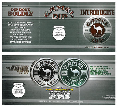 Outide and inside of point of sale ad/small brochure introducing and describing Camel Dip. "Cut To Be Different"