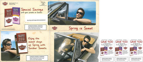 Spring themed direct mailing in promotion of Swisher Sweets cigars and cigarillos. Includes three coupons, each for $1.00 off a pack of cigars. "Spring is Sweet." "Enjoy the sweet days of Spring with Swisher Sweets."
