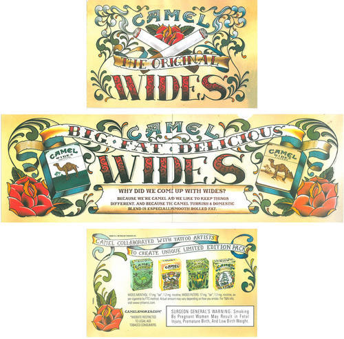 Direct mail from Camel in promotion of Camel Wides, featuring images of "unique limited edition packs" created in collaboration with tattoo artists.