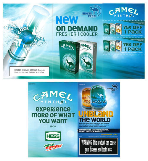 Direct mail piece from RJ Reynolds advertising both Camel Snus and Camel's new menthol blends. The piece is in promotion with Hess gas station convenience stores, and includes two coupons for $0.75 off a pack of Camel cigarettes in participating Hess stores.