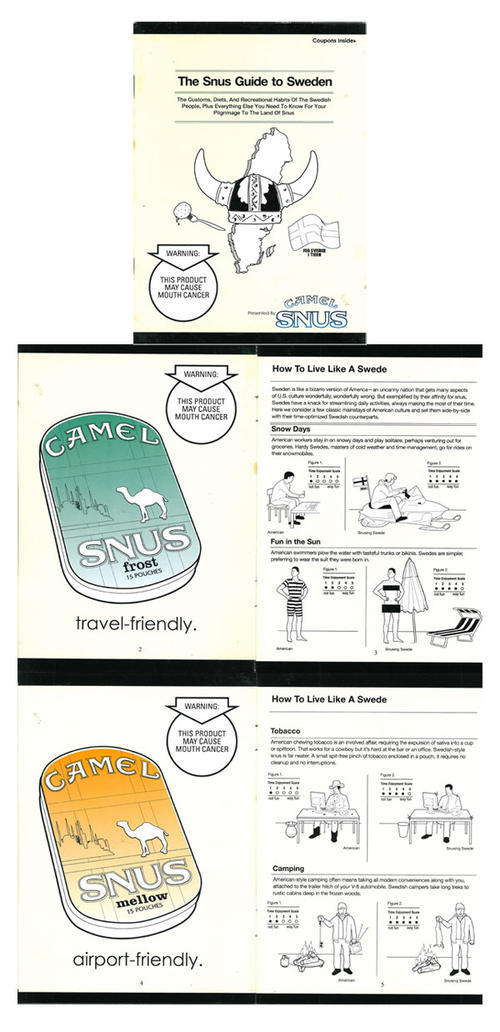 Booklet sent by direct mail in promotion of Camel Snus. The 14 page booklet is a humorous "snus guide to Sweden", a guide on "how to bail yourself out of global economic collapse". The last page of the booklet includes an "honorary citizen certificate".