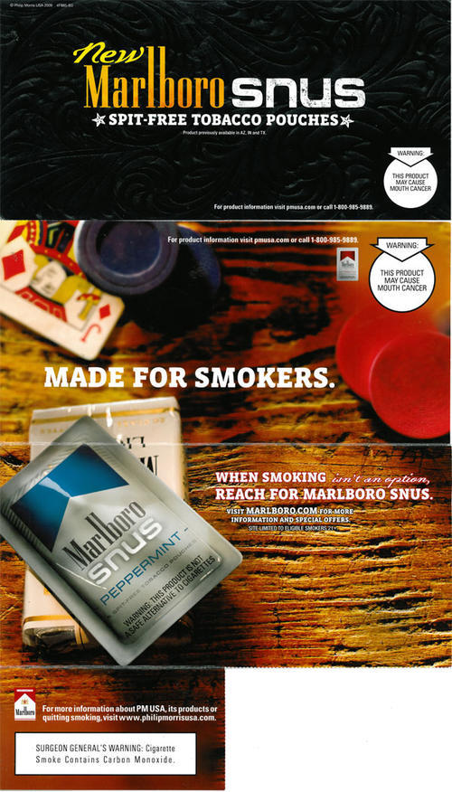 Direct mail in promotion of Marlboro Snus, featuring an image of the "Peppermint" style of the product. Text: "Made for smokers. When smoking isn't an option, reach for Marlboro Snus. Visit Marlboro.com for more information and special offers."