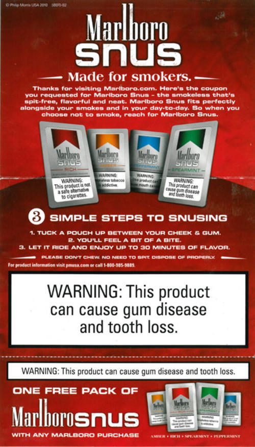 Direct mail in promotion of Marlboro Snus sent in July 2010, including a coupon for one free pack of Marlboro Snus with any Marlboro purchase. Mailing was based on coupon offer presented on the brand's website. Piece also includes "3 simple steps to snusing."