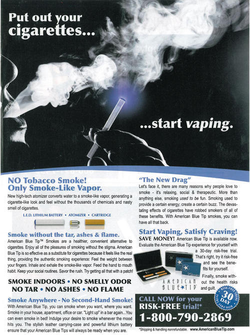 Magazine advertisement for American Blue Tip electronic cigarettes (or "e-cigarettes"). "Put out your cigarettes...start vaping." Ad includes a 1-800 phone number to call for a "risk-free trial".
