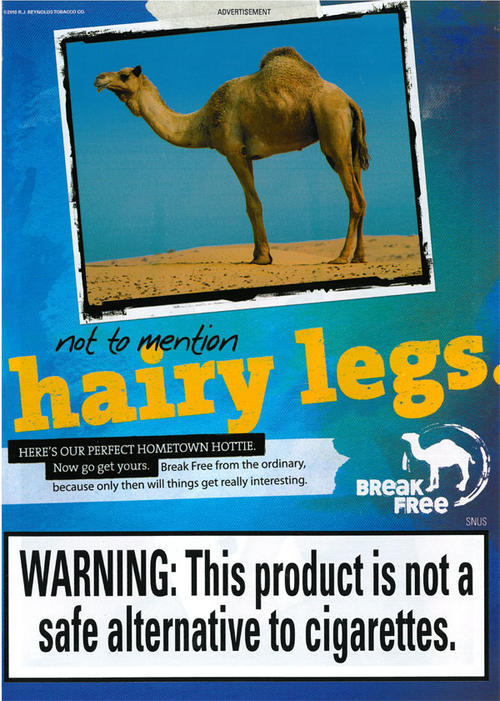 Page four of a four-page Camel Snus advertisement spread, which was found flanking and interspersed between pages of a contest feature in the August 2010 issue of Maxim magazine called, "Hometown Hotties 2010". This feature includes thumbnail sized images of 100 attractive women from across the country - readers can vote for their favorite women, and the woman with the most votes will win the title of Maxim's "Hometown Hottie".