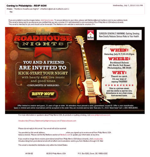 Email from Marlboro inviting the receiver to a private party event in Philadelphia - one of many events under the 2010 "Marlboro Roadhouse Nights" promotion. These parties feature “hearty eats, live music and good times” at bars in various cities as a way to reward Marlboro customers for their loyalty. The email assures readers that “there’s no catch” and that it’s Marlboro’s “way of saying thanks.”
