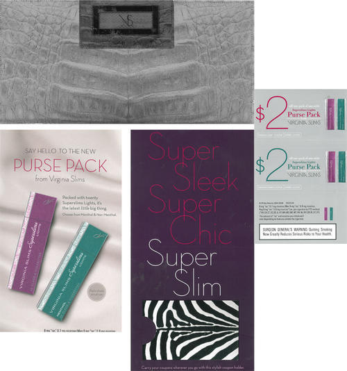 Direct mail from Virginia slims in promotion of its "purse pack" style, introduced by Philip Morris in late 2008/early 2009. Mailing is designed as a small purse and includes real size images of the purse packs. Text: "Say hello to the new purse pack from Virginia Slims. Packed with 20 Superslims Lights, it's the latest little big thing."